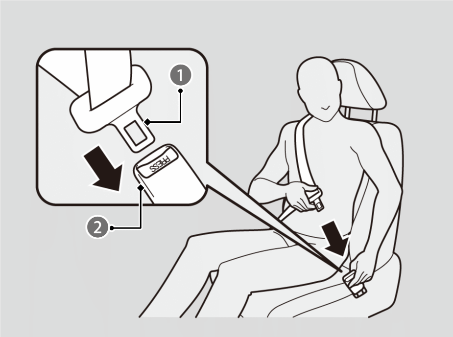 - シートベルトを外すには、バックルの赤色のPRESSを押してください。そのとき、ベルトが完全に収納されるようベルトに手を添えてください。
