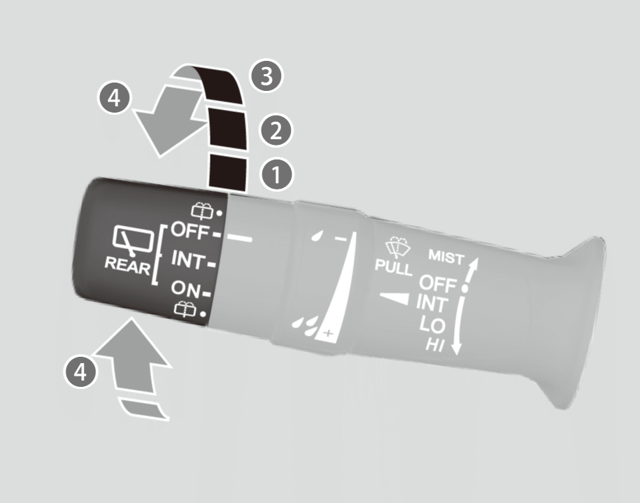 スイッチをまで回すと、ウォッシャー液が噴射します。スイッチを回している間はワイパーが作動し、スイッチを放すと数回ワイパーが作動して止まります。