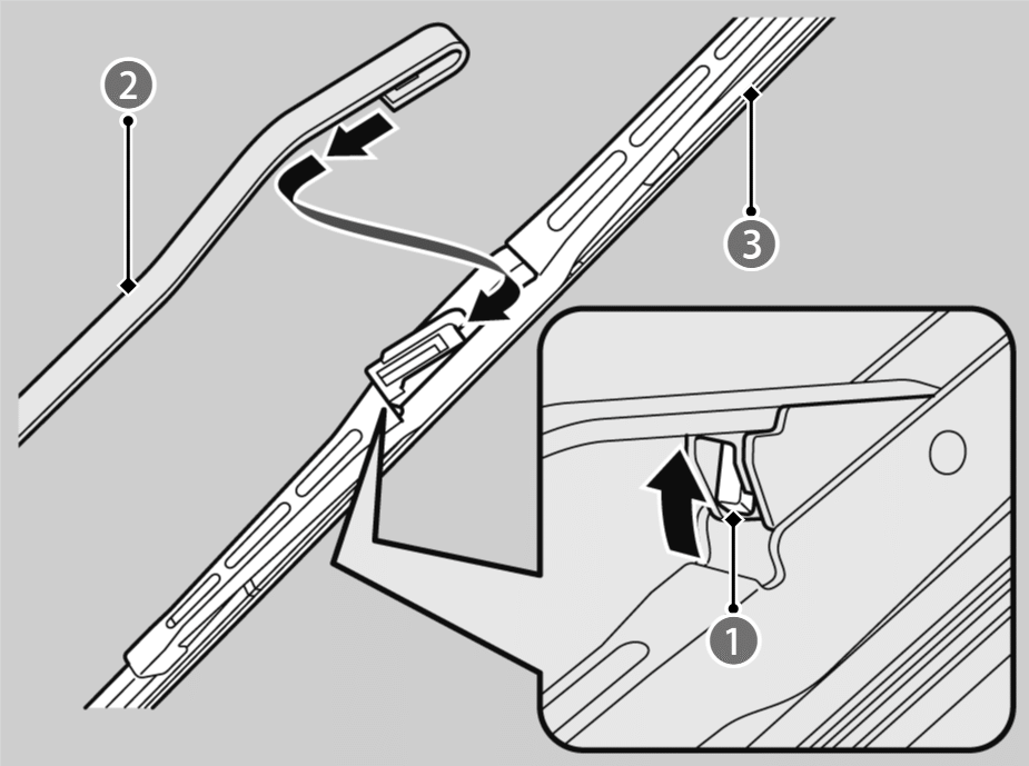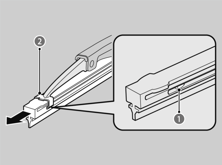 - ノブを押し上げながら、ワイパーアームからブレードをスライドさせて外す。