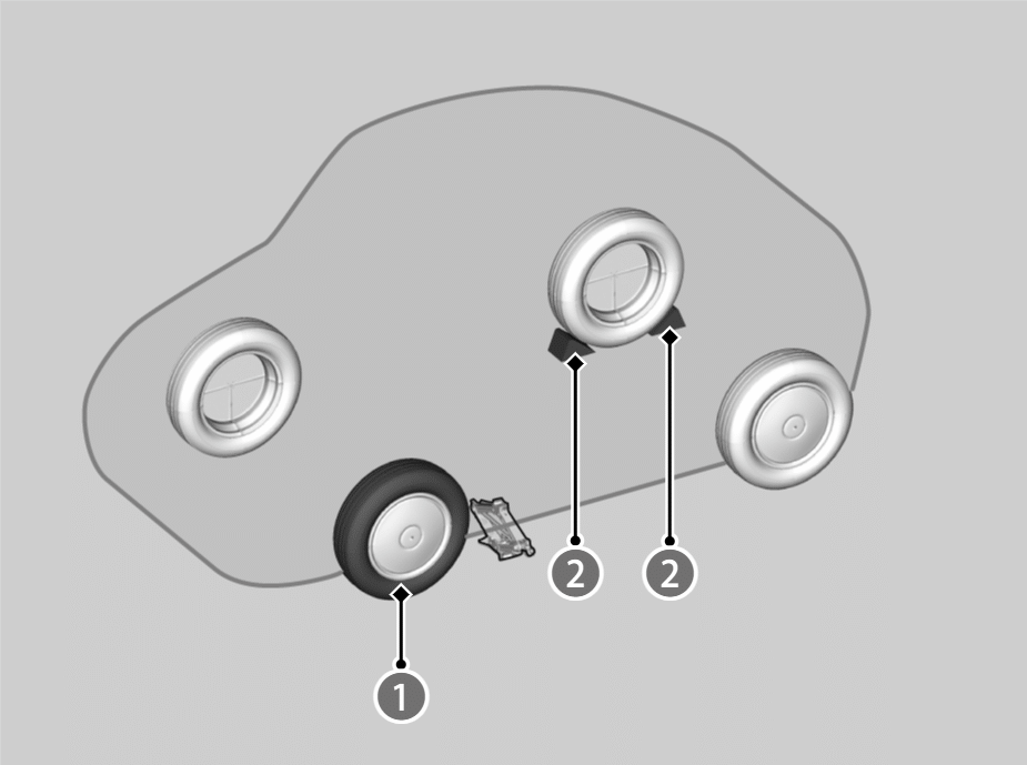 )の対角線上にあるタイヤの前後に、石などで輪留め(