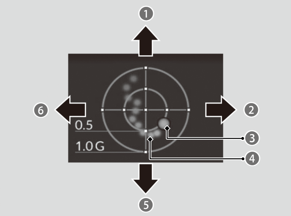 走行時、車両にかかる荷重の強さ (G) と方向を表示します。