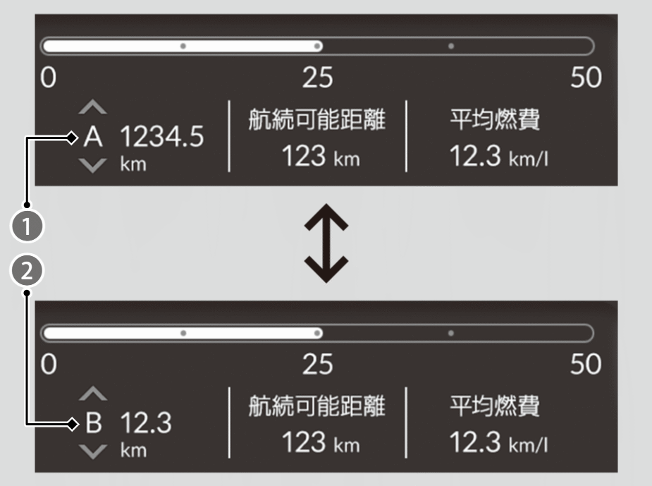 トリップメーターA、Bと連動し、それぞれの平均燃費を一定時間ごとに更新して表示します。