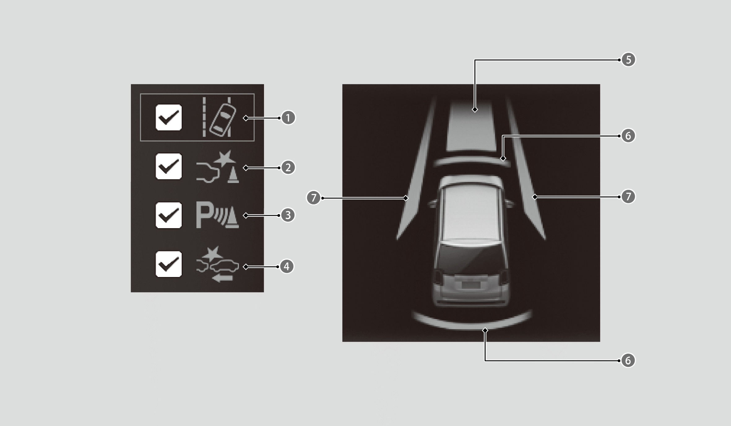 安全支援情報表示灯がグリーンで点灯します。いずれかがONのときは、グリーン/グレーで点灯し、すべてがOFFのときはグレーで点灯します。 - 衝突軽減ブレーキがOFFのときは、