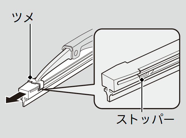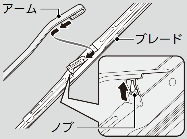 ブレードを外した状態でワイパーアームが倒れると、ガラスが損傷するおそれがあります。