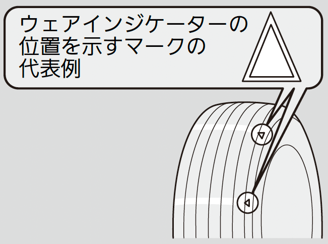 接地面が摩耗して、ウェアインジケーターと同じ高さになったら、タイヤを交換してください。