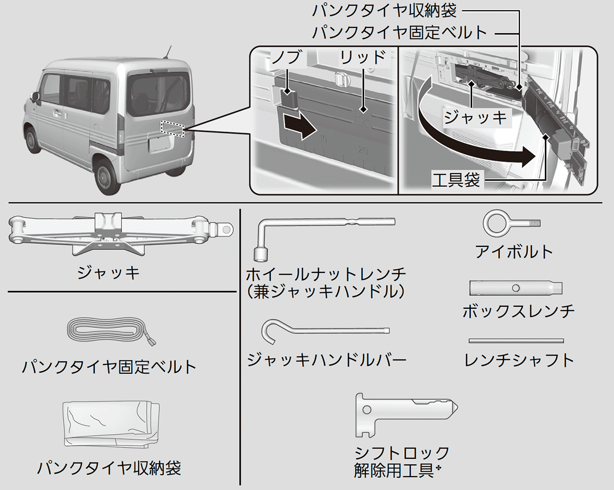 工具はカーゴスペース内に収納されています。リッドを取り外す際は、ノブを車両後方に引いてリッド前方部を外してから取り外してください。収納工具の紛失防止のため、工具のストラップをきちんと締めてください。