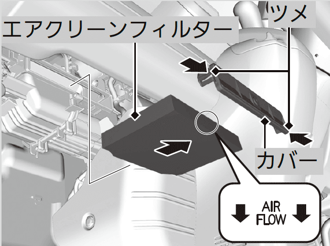 エアクリーンフィルターは、通常1年または15,000kmごとに交換してください。粉じんなどの多い場所で使用される場合は、早めの交換をおすすめします。