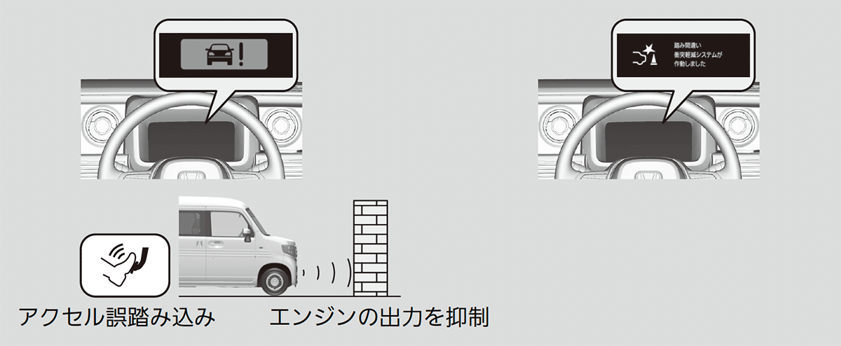 停車時や約10㎞/h 以下で走行しているとき、自車のほぼ正面もしくは真後ろの近距離に壁などの障害物があるにもかかわらず、アクセルペダルを必要以上に強く踏み込んだ場合には、警告音と警告表示で知らせるとともにエンジンの出力抑制をすることで急な前進・後退を防止します。