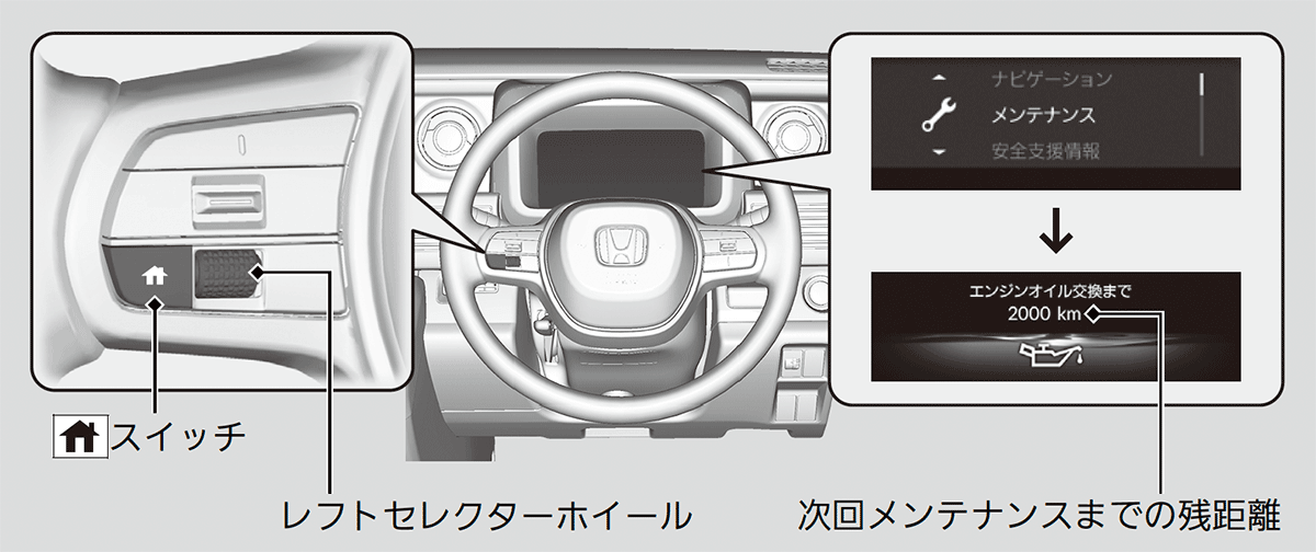 残距離表示が十分残っていても、前回のオイル交換からの経過時間に応じてメンテナンスが必要です。詳しくはメンテナンスノートを確認してください。