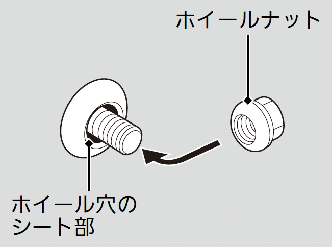 - ホイールナットがホイール穴のシート部に軽く当たり、ホイールがガタつかない程度までホイールナットを締める。