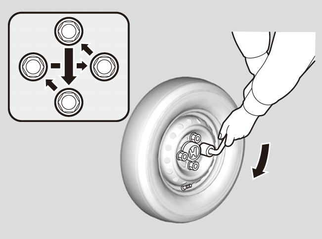 - ジャッキをおろし、図の順に2 ~ 3度にわたり、ホイールナットをしっかりと締め付ける。