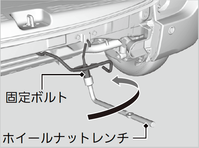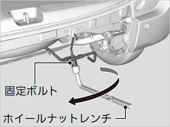 - ホイールナットレンチを使用して、固定ボルトをゆるめる。