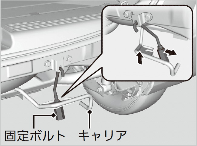 取り外しや収納するときに手などをはさまないように注意する。固定ボルトをゆるめすぎない。キャリアが落下して足などにけがをするおそれがあります。