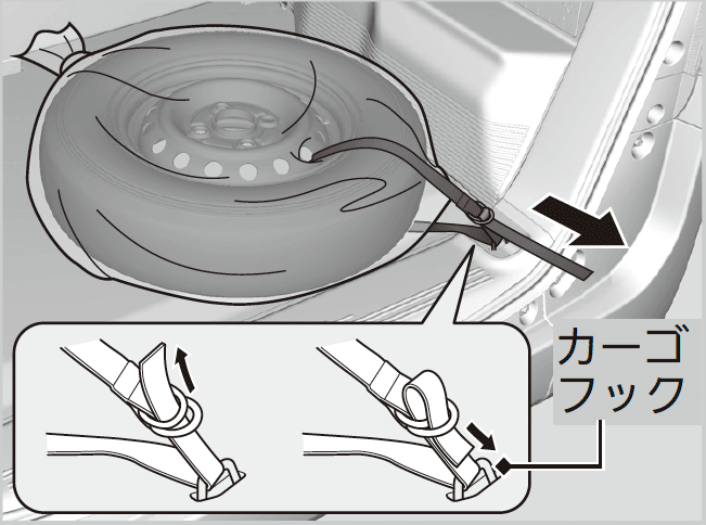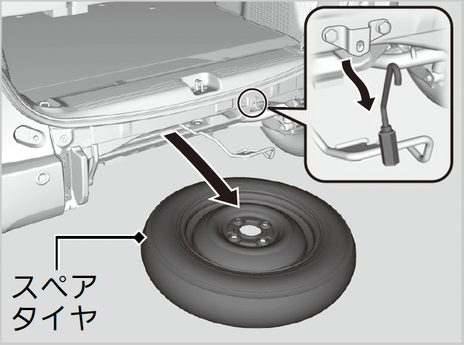 - 応急用スペアタイヤを取り付ける。
