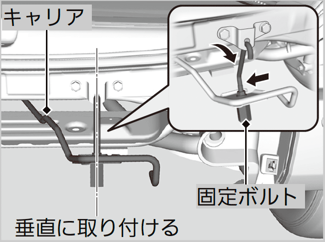 - 固定ボルトを車体に引っかけてから固定ボルトをキャリアにかける。