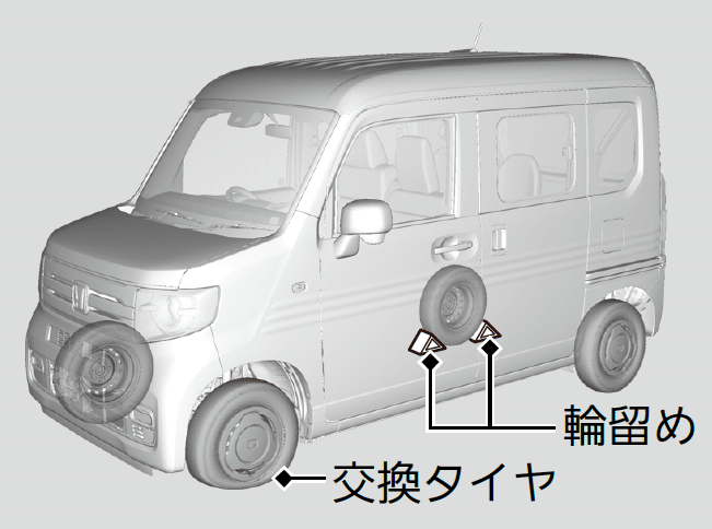 - 交換するタイヤの対角線上にあるタイヤの前後に、石などで輪留めをする。