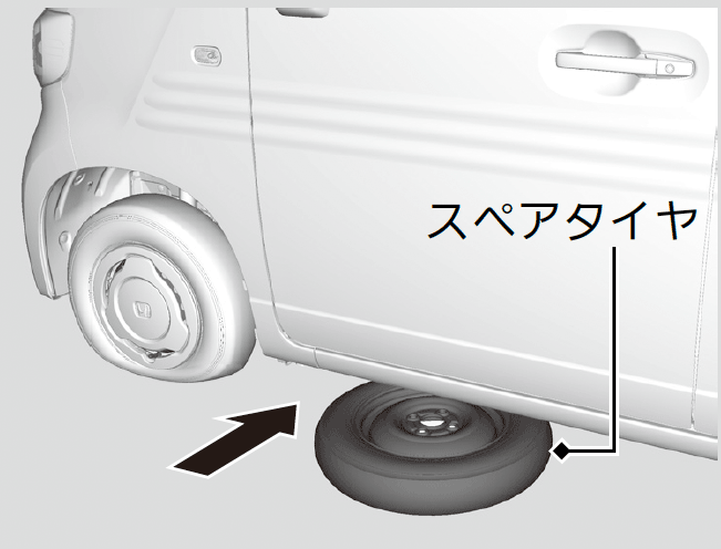 - 応急用スペアタイヤを交換するタイヤ近くの車体の下に、ホイール表面を上にして置く。