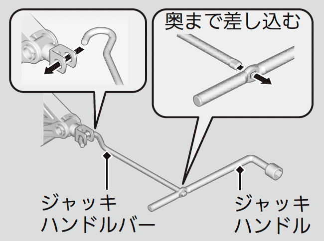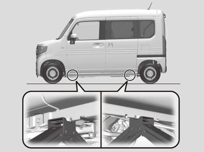 この車に搭載されているジャッキをお使いください。他のジャッキでは支えられる重量(呼荷重)が不足したり、形状が合わないことがあります。