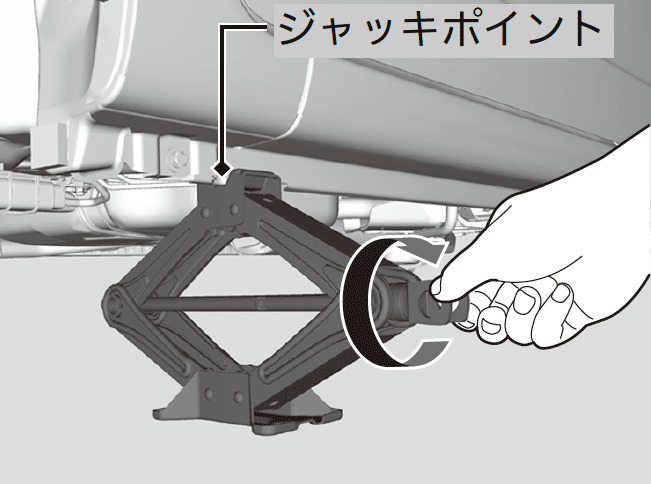 - ジャッキの上部がジャッキポイントに接触するまで図の部分を矢印の方向に回す。