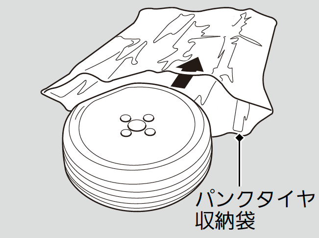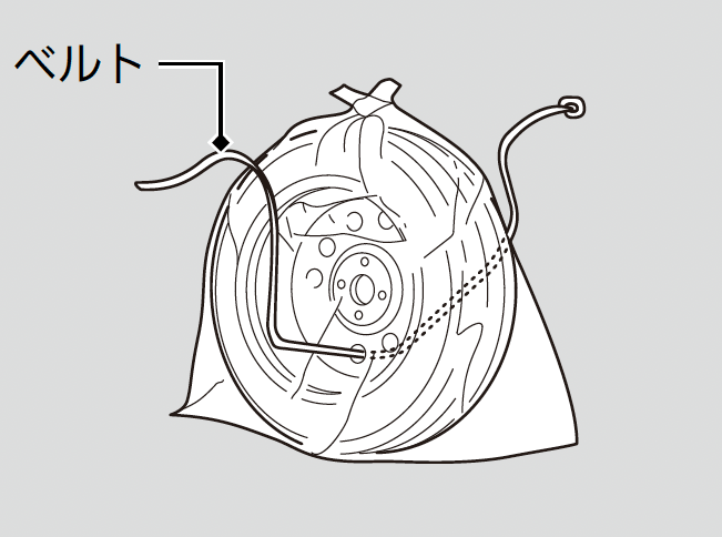 - パンクタイヤ収納袋にタイヤを入れ、収納袋の上端を縛る。