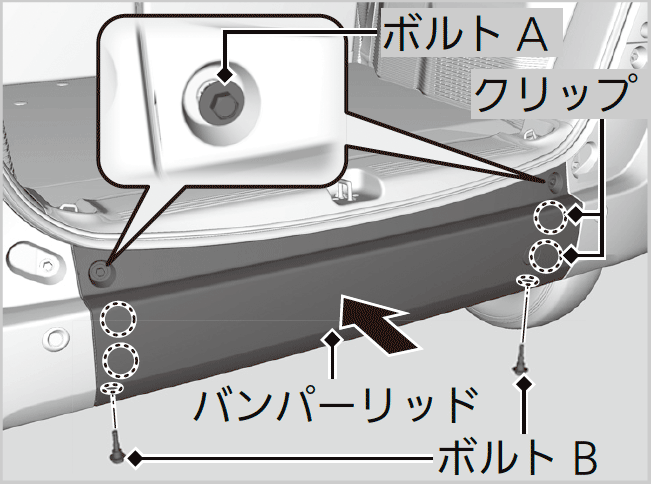 - ボルトAとボルトBを締め付ける前にバンパーリッドのクリップがしっかりはまっていることを確認してください。