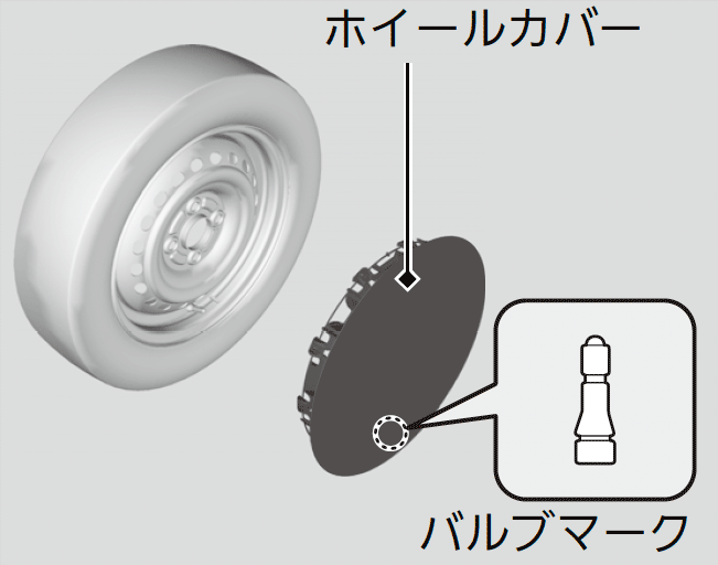 ホイールカバーを取り付けるときは、ホイールにあるタイヤバルブの位置にホイールカバーのバルブマークを合わせてから取り付けてください。