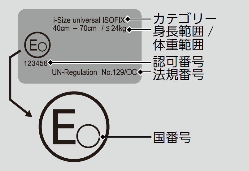 UN基準の認可を受けたジュニアシートには、認可マークが表示されています。ジュニアシートについている認可マークを確認してください。