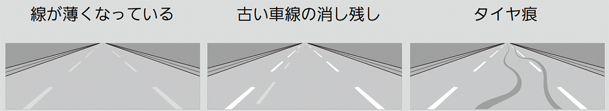 - 道路の修復や劣化などにより重複やかすれている白線(黄線)、タイヤ痕、さまざまな線が道路にあるとき
