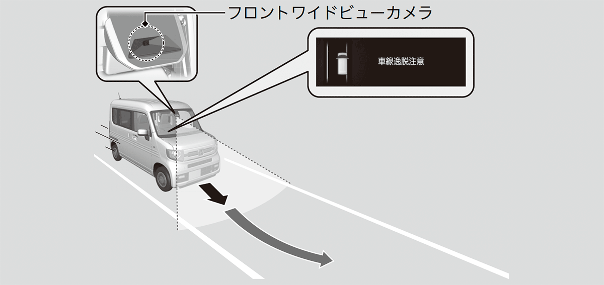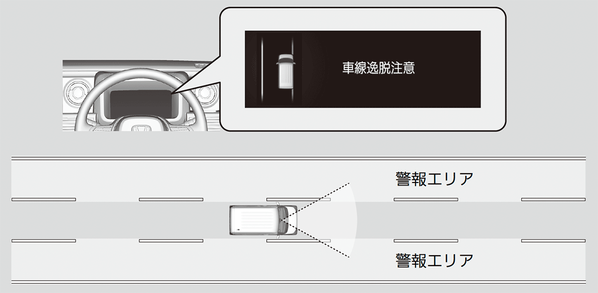 車が警報エリアに入ると車線逸脱の警報を音およびディスプレイ表示で行います。