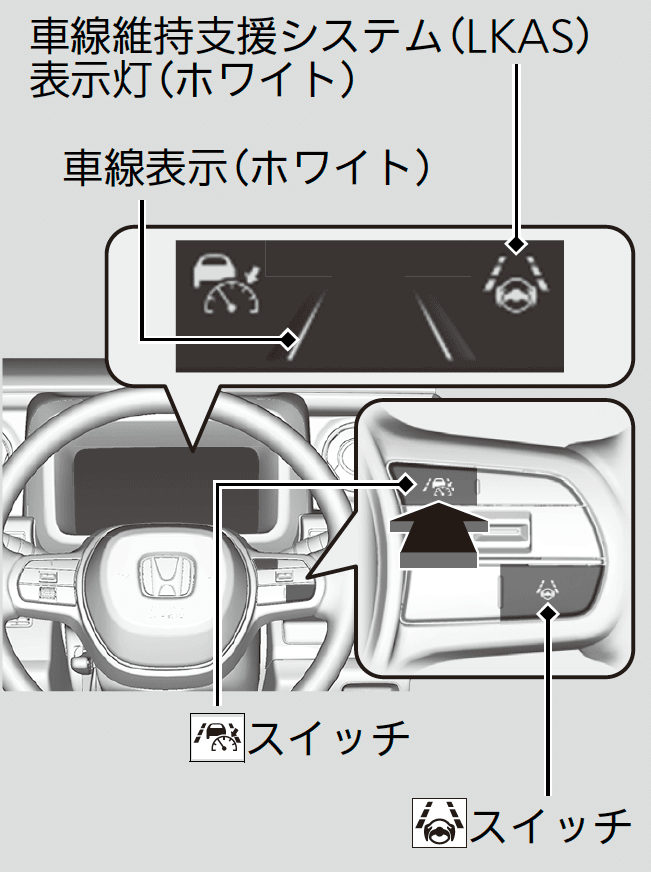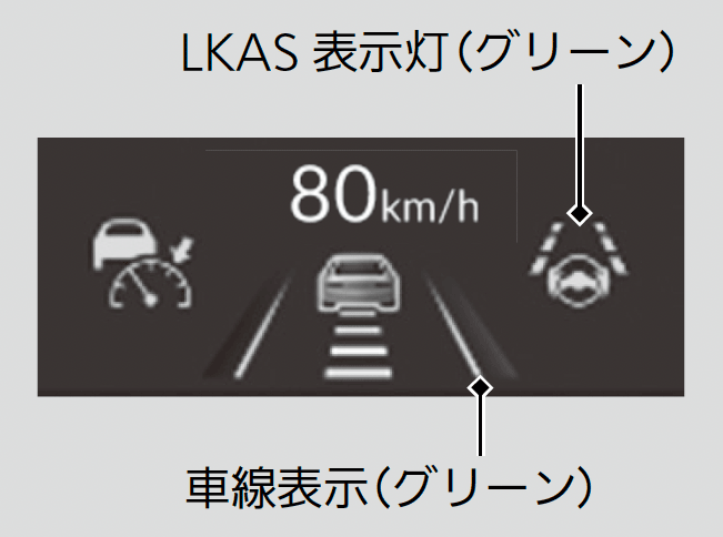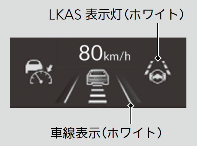 (ホワイト)とともに車線維持支援システム(LKAS)表示灯(ホワイト)が点灯し、システムが待機状態になります。