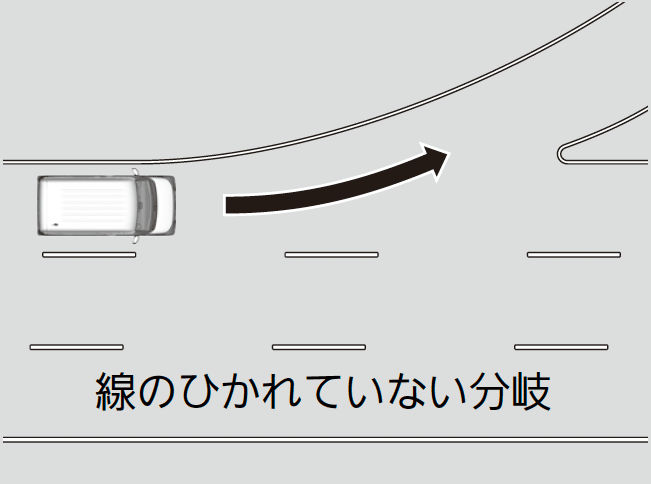 - 交差点や横断歩道など車線の数が増減している区間や車線が複雑に交差している区間を走行するとき