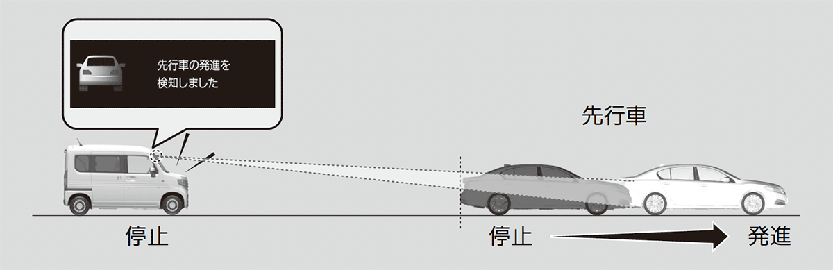 先行車に続いて停車(停止状態での車間距離が約10m以内、かつ自車・先行車がしばらく停止)すると先行車を認識し続け、先行車の発進を検知しても自車が停止し続けたときに作動します。