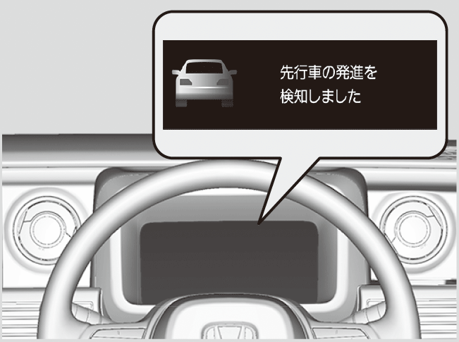 信号待ちなどで、先行車が発進したことに気づかず停止し続けたときに、音と表示で運転者に知らせるシステムです。