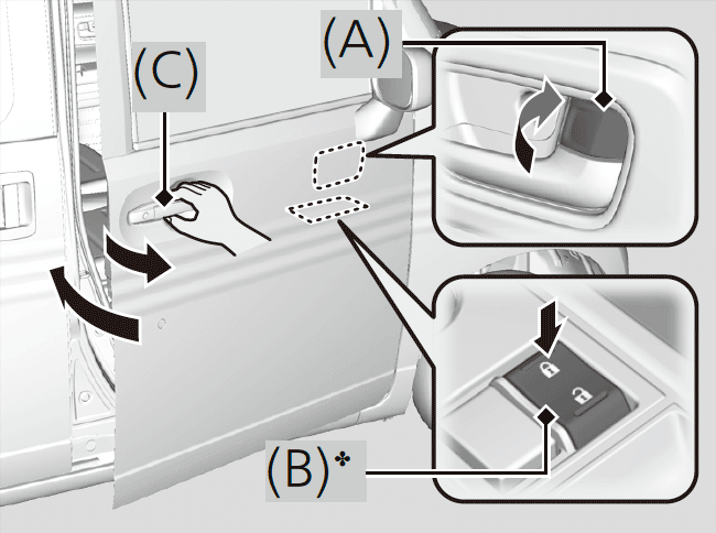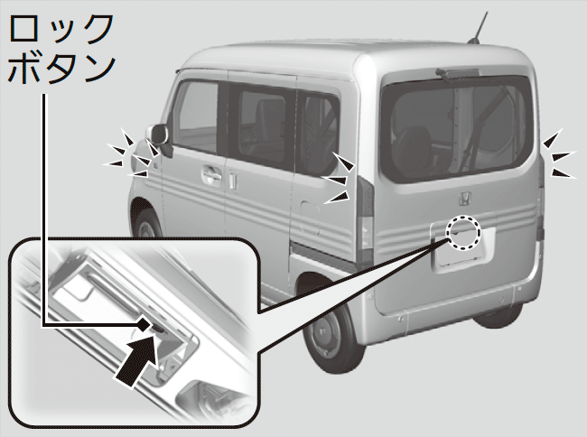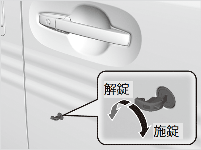 運転席ドアで施錠すると、他のすべてのドア、テールゲートも同時に施錠されます。施錠の際は車内にキーを置き忘れないようにしてください。