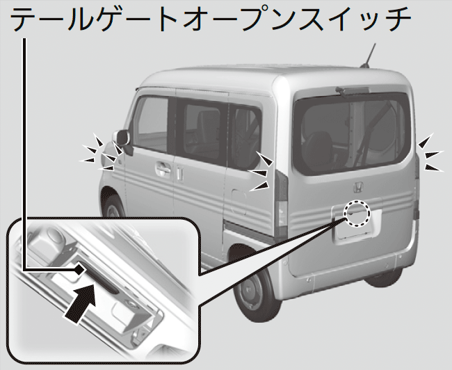 - ドアハンドルまたはテールゲートオープンスイッチより約80cm以内の距離でも、Hondaスマートキーが地面の近くや高い位置にあるときは作動しないことがあります。