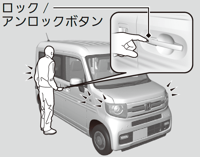 - 同じ作動範囲にHondaスマートキーを携帯している人がいるときは、携帯していない人でもロック/ アンロックボタンで施錠/解錠操作ができます。