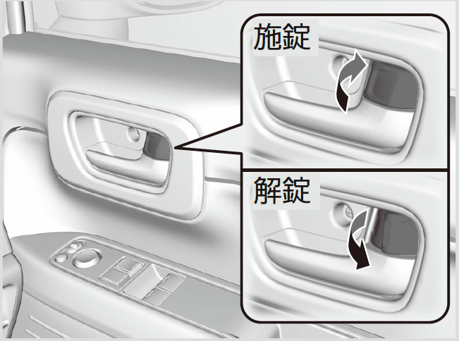 運転席ドアのノブで施錠/解錠すると、ほかのすべてのドアとテールゲートも同時に施錠/解錠されます。