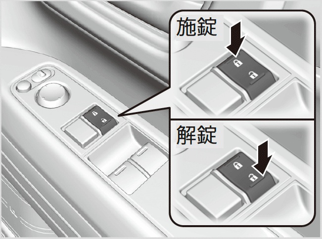 運転席ドアのマスタードアロックスイッチで施錠/解錠すると、ほかのすべてのドアとテールゲートも同時に施錠/解錠されます。