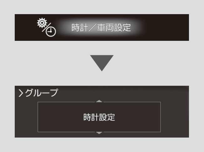 - レフトセレクターホイールで「時計/車両設定」を表示させ、決定する。