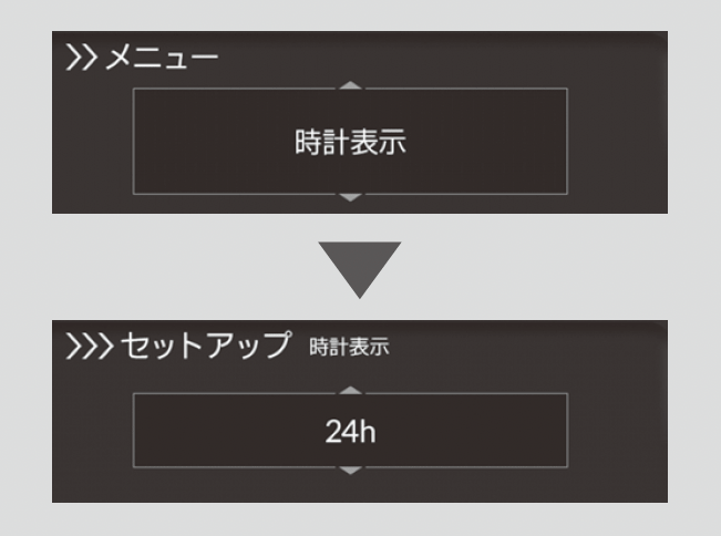 - 「12h」または「24h」を選択すると時計表示が12時間または24時間に切り替わります。