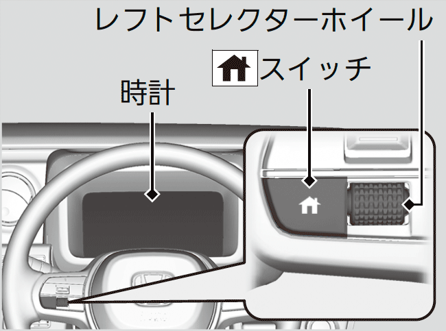 スイッチを押します。レフトセレクターホイールを回して表示を切り換え、レフトセレクターホイールを押して決定します。