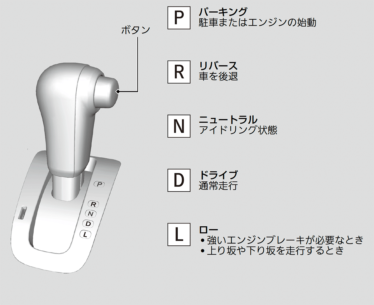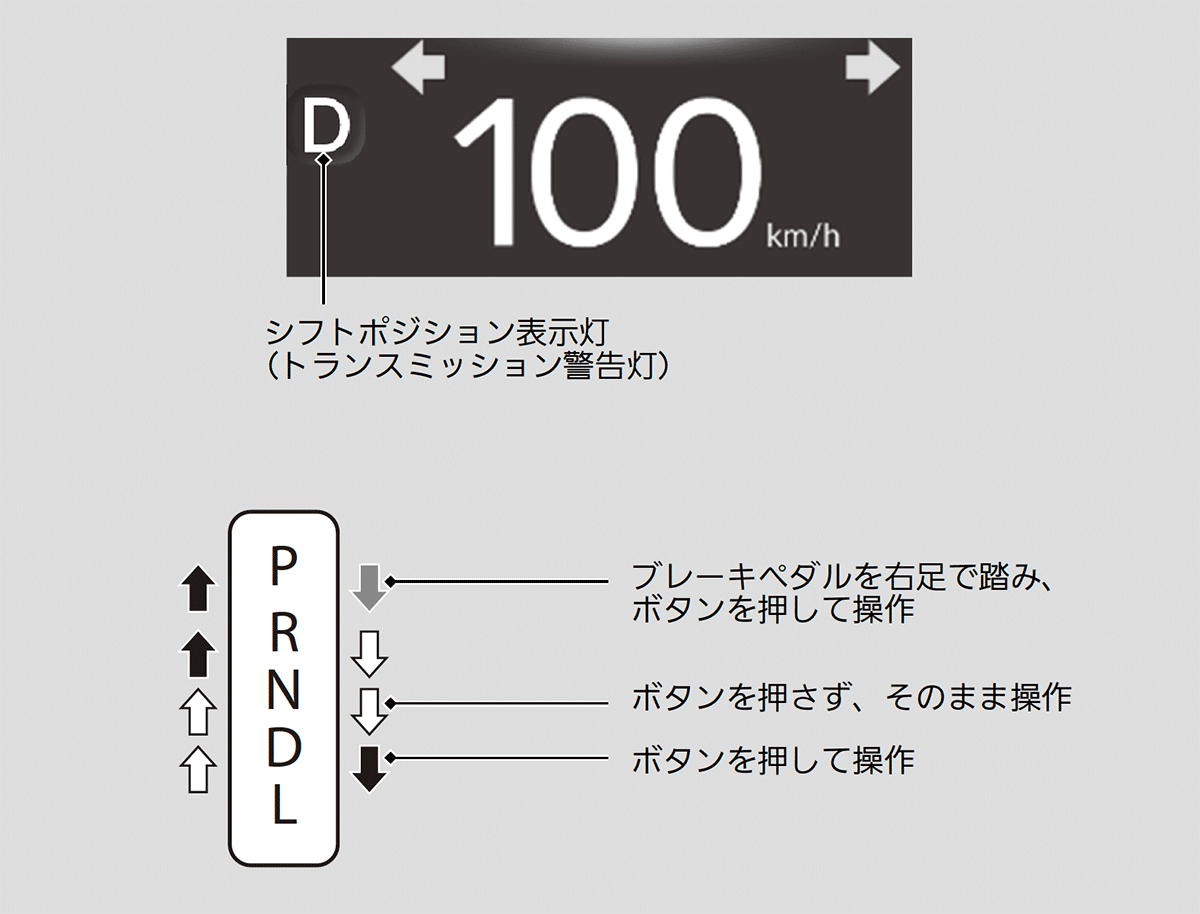 シフトポジションは、メーター部にあるシフトポジション表示灯と連動し、現在のポジションを表示灯の点灯で表示します。