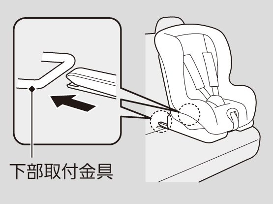 下部取付金具周辺に、異物やシートベルトのかみ込みがないか確認する。異物やシートベルトをかみ込むとチャイルドシートが確実に固定されず、ブレーキや衝突のときなどにチャイルドシートが飛び出し、傷害を受けるおそれがあります。リヤシートが確実に固定されているか確認する。確実に固定されていないと、ブレーキや衝突のときなどにシートといっしょにチャイルドシートが動き、傷害を受けるおそれがあります。