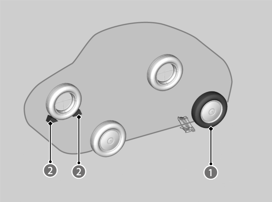 )の対角線上にあるタイヤの前後に、石などで輪留め(