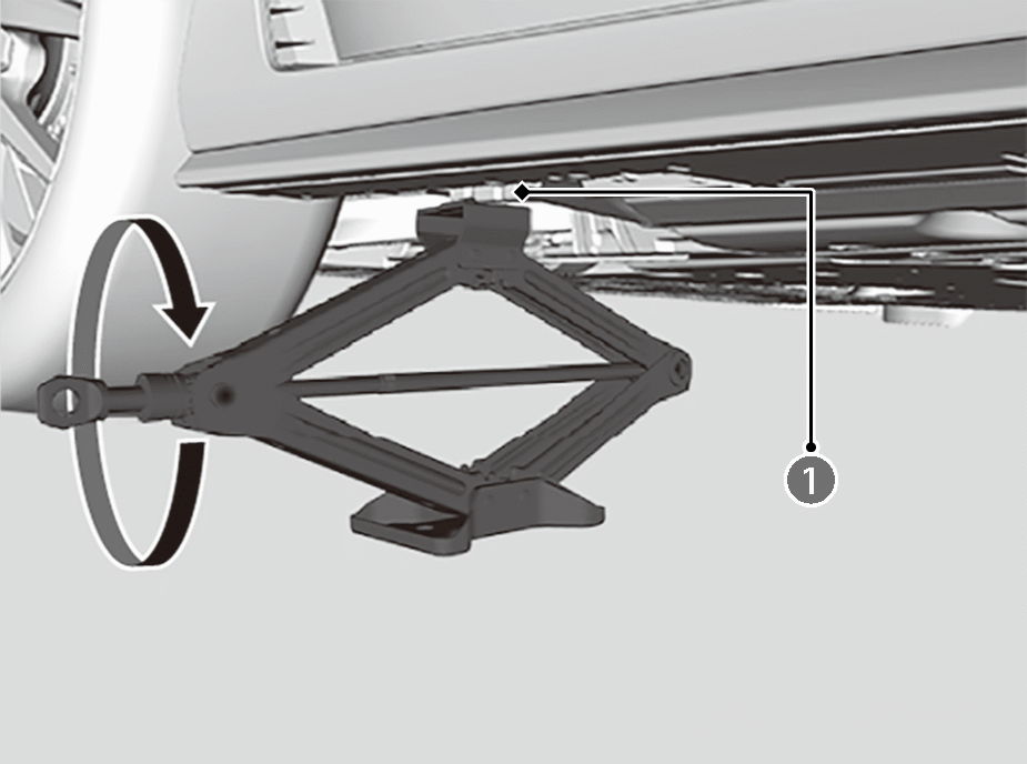 )に接触するまで図の部分を矢印の方向に回す。- ジャッキの溝にジャッキポイントがはまったことを確認してください。