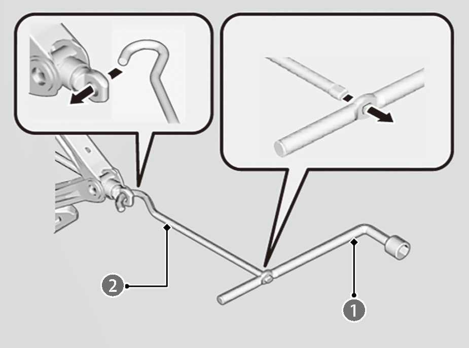 )を使って、タイヤが地面から離れるまで車体を上げる。- ジャッキハンドルバーはジャッキハンドルに奥まで差し込んでください。