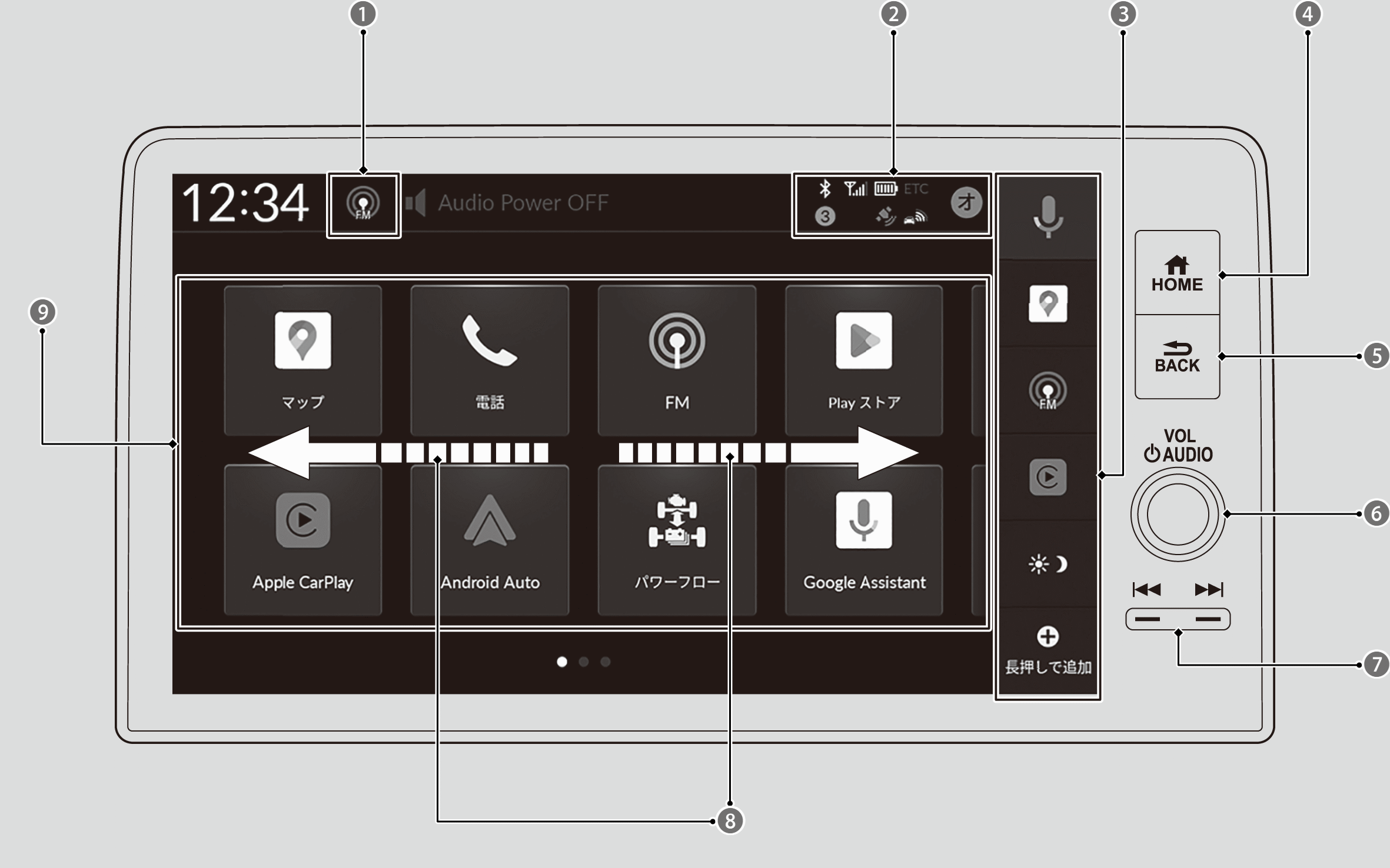- 一部のオーディオ機能は、タッチ・スワイプ・スクロール等で操作できます。