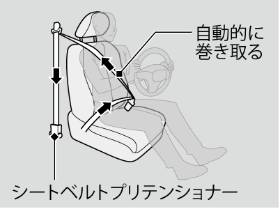 シートベルトプリテンショナーは、一定以上の前方向からの衝撃を受けると自動的にシートベルトを引き込み、拘束します。