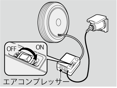 - エアコンプレッサーの電源コードのプラグを、アクセサリーソケットに差し込む。