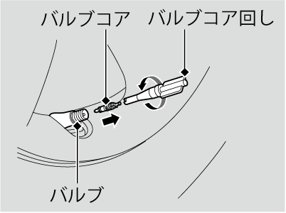 タイヤの空気は完全に抜く。タイヤに空気が残っていると、バルブコアが飛び出し、傷害を受けるおそれがあります。